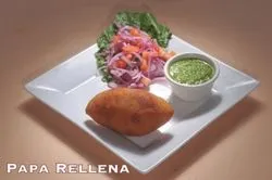 Potato stuffed with chopped beer, onions, tomatoes, and a hint of raisins and botiga olives. Garnished with salsa criollo and served with an aji hot sauce.