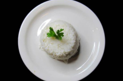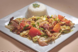 Sliced lean chicken sautéed with green cabbage, red onions, and tomatoes. Served with garlic steamed rice.